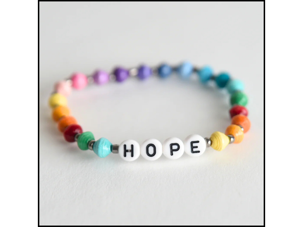 Each bracelet is crafted from delicately rolled paper beads. Paper beads measure approximately .25 inches and are strung on clear elastic.
