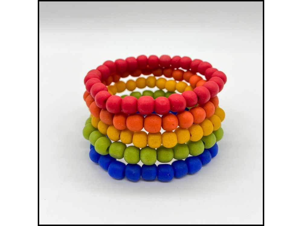 Each bracelet is made from recycled glass. Bracelets have clear elastic band. (~7.5") Available in multiple colors
