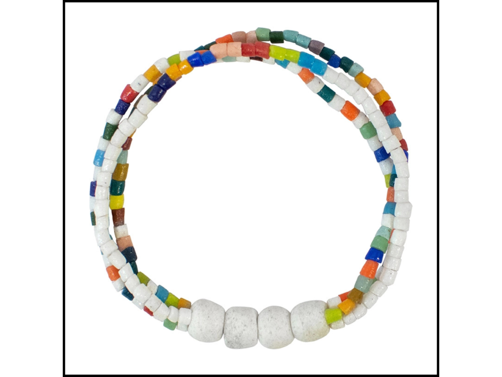 Each bracelet is made from recycled glass. Bracelets have clear elastic band. (~8")
