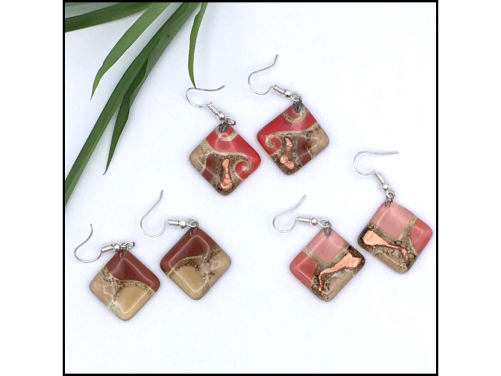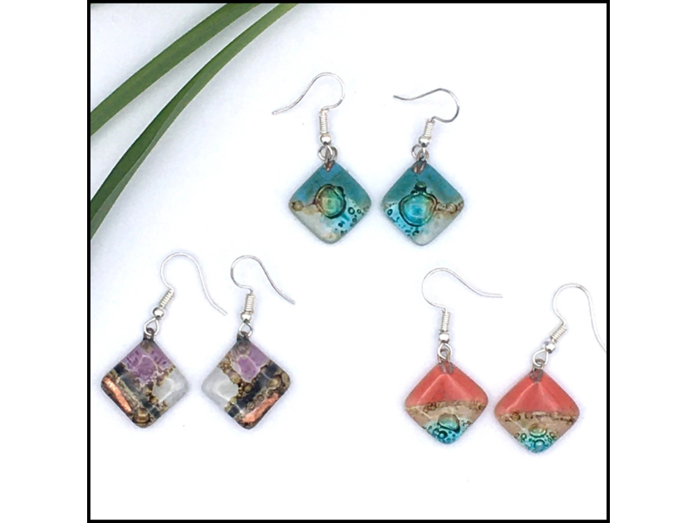 These beautiful fused glass earrings are created from upcycled single windowpane glass by a women's collective in Ecuador. Ear wires are made of surgical stainless steel, uniquely handmade so colors will vary.
