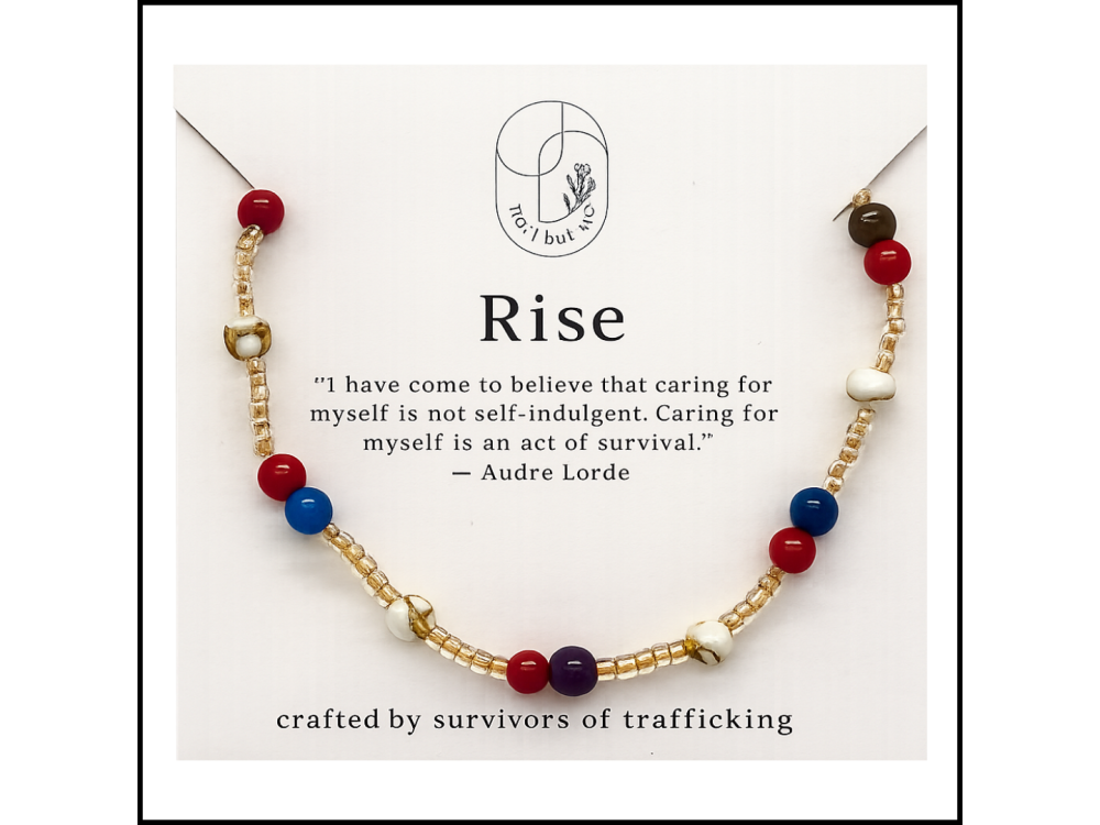 The Rise Bracelet is a handmade, semi-precious stone bracelet designed to support those navigating trauma, freeze, or emotional shutdown. Using activating breathwork embedded into its bead pattern, this bracelet helps reignite movement, focus, and inner strength. Inspired by Sassy, a resilient survivor who rose from deep hardship, this bracelet carries the spirit of rising again and again. Crafted by survivors of trafficking at Not I But We, it’s a meaningful wellness tool and a beautiful reminder: no darkness is too deep to rise from. Materials: Dyed Jade, Howlite, Miyuki Seed beads, stretch cord Features: Breath activation practice (2 short inhales, 1 exhale) built into bead layout