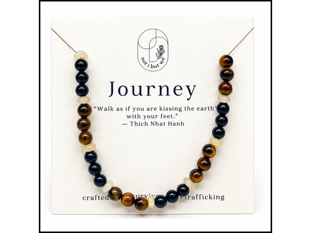 The Journey Bracelet is a handcrafted, semi-precious stone bracelet designed to support mindfulness, resilience, and healing. Featuring grounding Tiger’s Eye paired with your choice of calming Howlite or stabilizing Agate, this bracelet is both meaningful and wearable. It includes a simple breath and walking meditation practice inspired by Thich Nhat Hanh to encourage presence and gratitude. Each piece is ethically made by survivors of human trafficking in South Africa through Not I But We, a trauma-informed social enterprise. Wear it as a daily reminder to stay grounded, say “yes” to life, and find grace in every step of your journey. Materials: Tiger’s Eye, Howlite or Agate, durable stretch cord Features: Meditation practice built into bead design