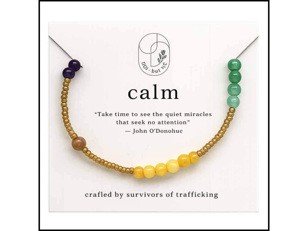 The Calm mindfulness bracelet reminds us to take a sensory inventory when we are feeling dysregulated. It helps get your thinking brain back online before you ‘flip your lid.’ Beading this bracelet over and over has helped survivors regulate their nervous systems. One artisan shared that when she was feeling triggered, she remembered this practice and began to take a sensory inventory before she "flipped her lid." This bracelet helps us all heal, together. Made with semi-precious gemstones, Miyuki glass beads, and elastic.