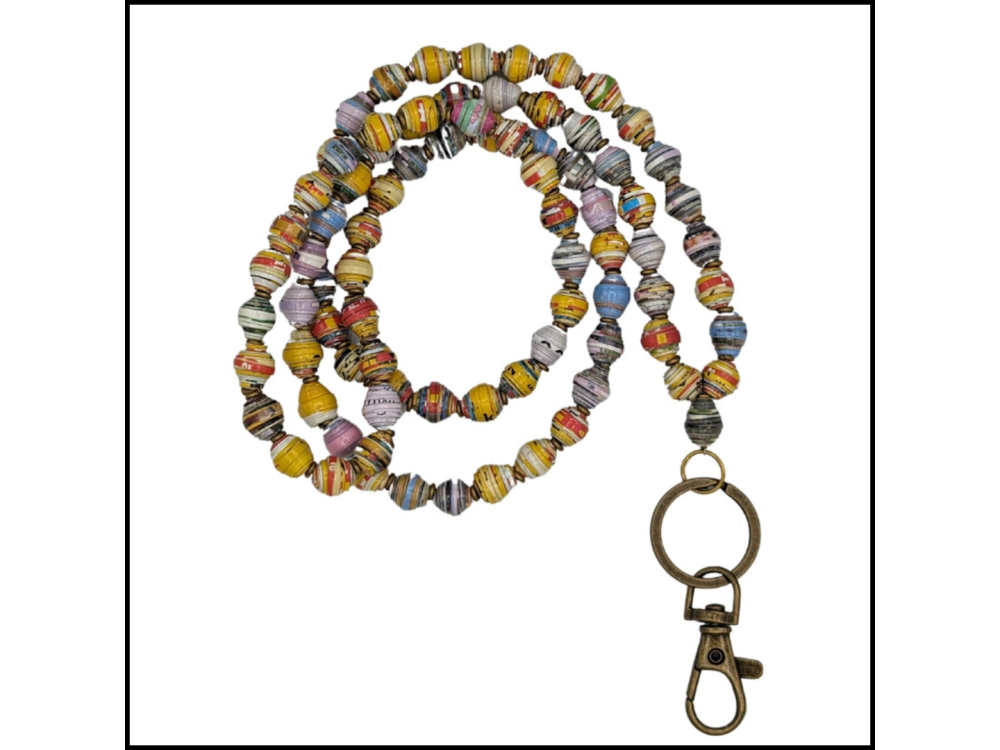 Perfect for holding a work badge, keys or name tags, this lanyard is made of individually rolled paper beads strung together and features a brass keyring with lobster clip. Handmade in Kenya, proceeds provide job opportunities for artisans