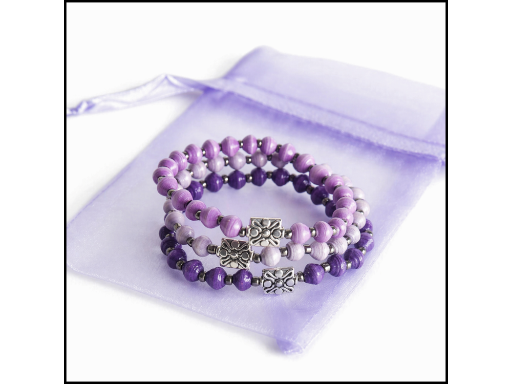 Three bracelets, one powerful message: faith endures. A set of three handmade paper bead bracelets in radiant shades of purple, the color of faith, wisdom, and spirituality. Wear them as a daily reminder to stay grounded in purpose and uplifted in spirit.