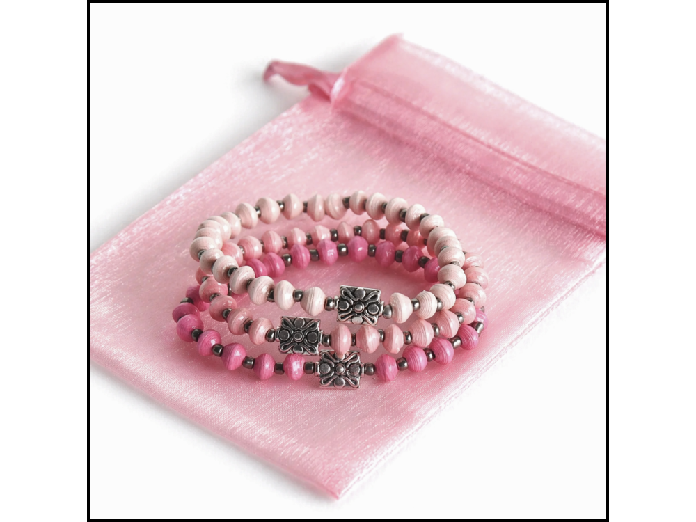 Adorn your wrist with a trio of shades of pink bracelets, made from recycled paper. A set that’s soft yet powerful. These pink bracelets make a bold statement of hope and strength.