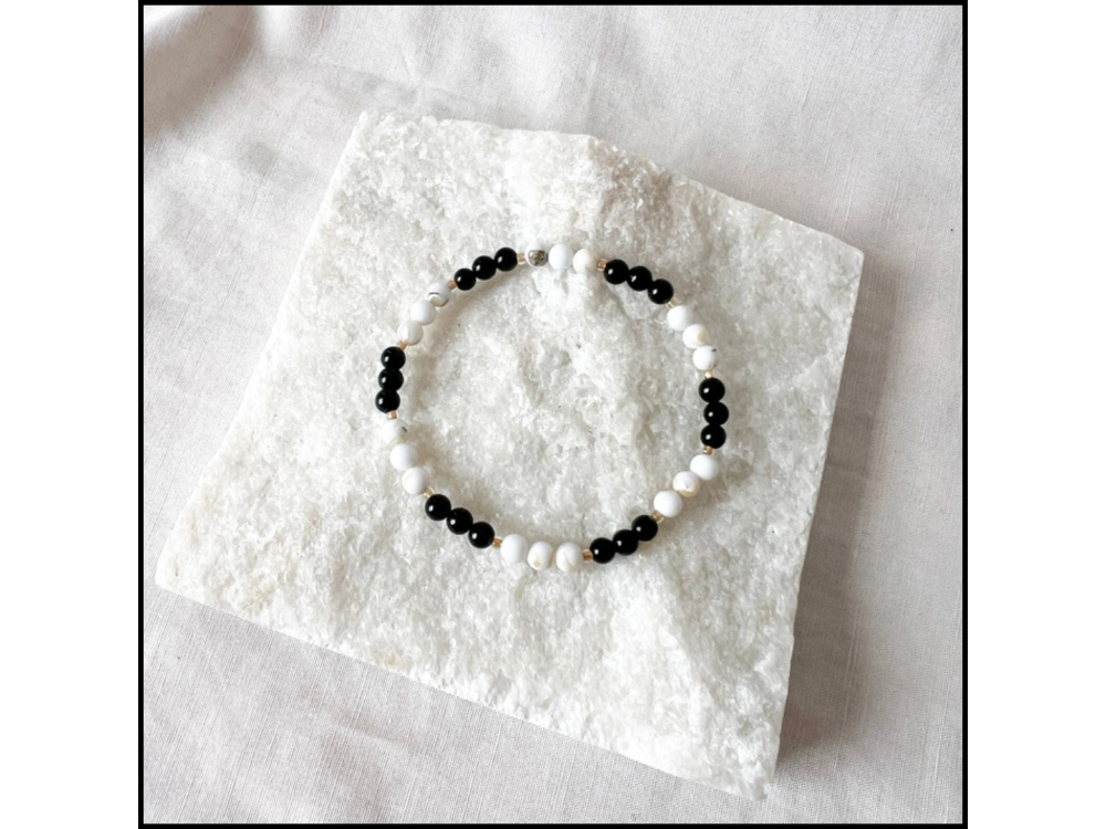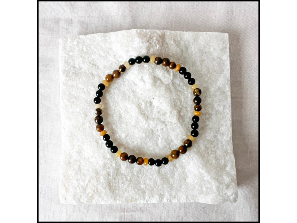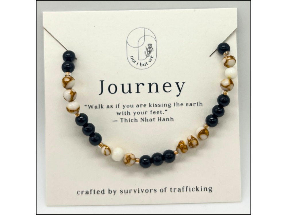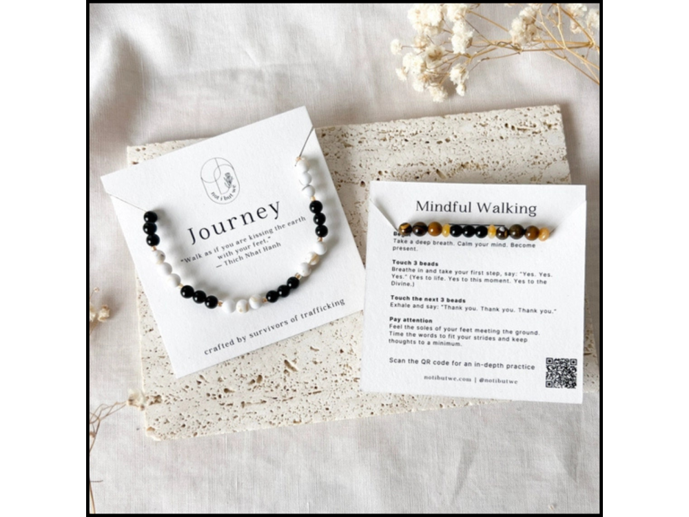 The Journey Bracelet is a handcrafted, semi-precious stone bracelet designed to support mindfulness, resilience, and healing. Featuring grounding Tiger’s Eye paired with your choice of calming Howlite or stabilizing Agate, this bracelet is both meaningful and wearable. It includes a simple breath and walking meditation practice inspired by Thich Nhat Hanh to encourage presence and gratitude. Each piece is ethically made by survivors of human trafficking in South Africa through Not I But We, a trauma-informed social enterprise. Wear it as a daily reminder to stay grounded, say “yes” to life, and find grace in every step of your journey. Materials: Tiger’s Eye, Howlite or Agate, durable stretch cord Features: Meditation practice built into bead design