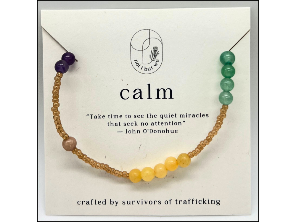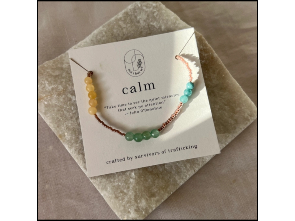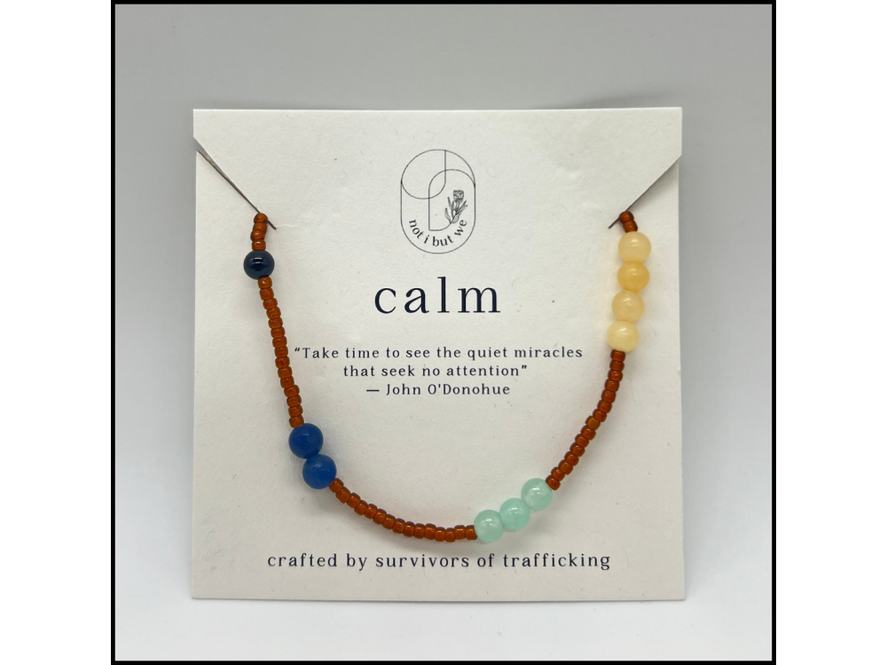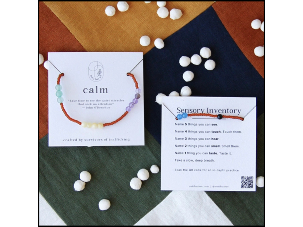 The Calm mindfulness bracelet reminds us to take a sensory inventory when we are feeling dysregulated. It helps get your thinking brain back online before you ‘flip your lid.’ Beading this bracelet over and over has helped survivors regulate their nervous systems. One artisan shared that when she was feeling triggered, she remembered this practice and began to take a sensory inventory before she "flipped her lid." This bracelet helps us all heal, together. Made with semi-precious gemstones, Miyuki glass beads, and elastic.