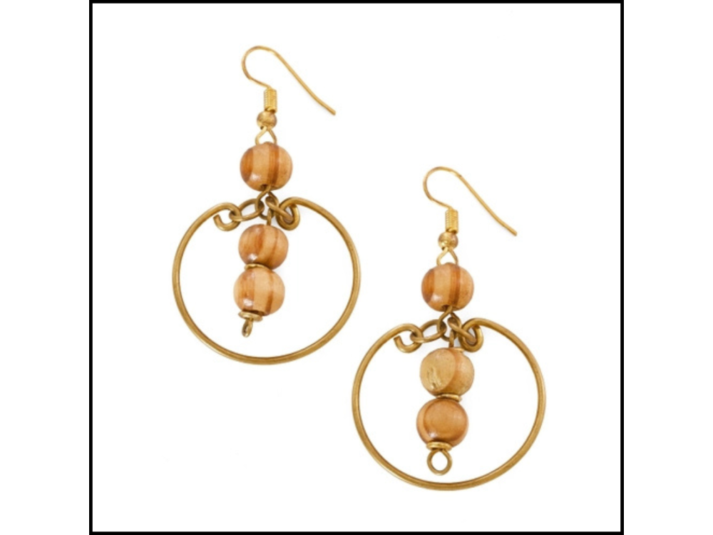 Handmade by artisans in Kenya, these earrings feature smooth natural wood beads suspended within a warm brass hoop. The open, balanced design creates a gentle sense of movement, making them an easy, everyday piece with a natural, organic feel. Because these are handcrafted items, each will vary slightly. Dimensions: 2"L x 1.25"W