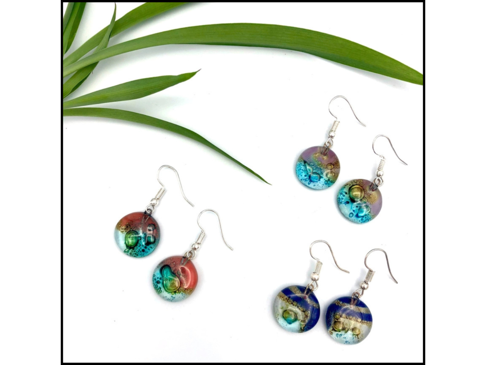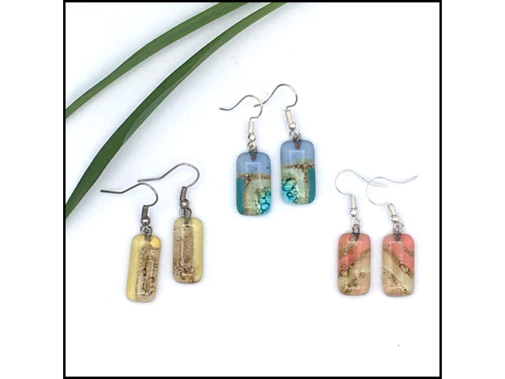 These beautiful fused glass earrings are created from upcycled single windowpane glass by a women's collective in Ecuador. Ear wires are made of surgical stainless steel, uniquely handmade so colors will vary.