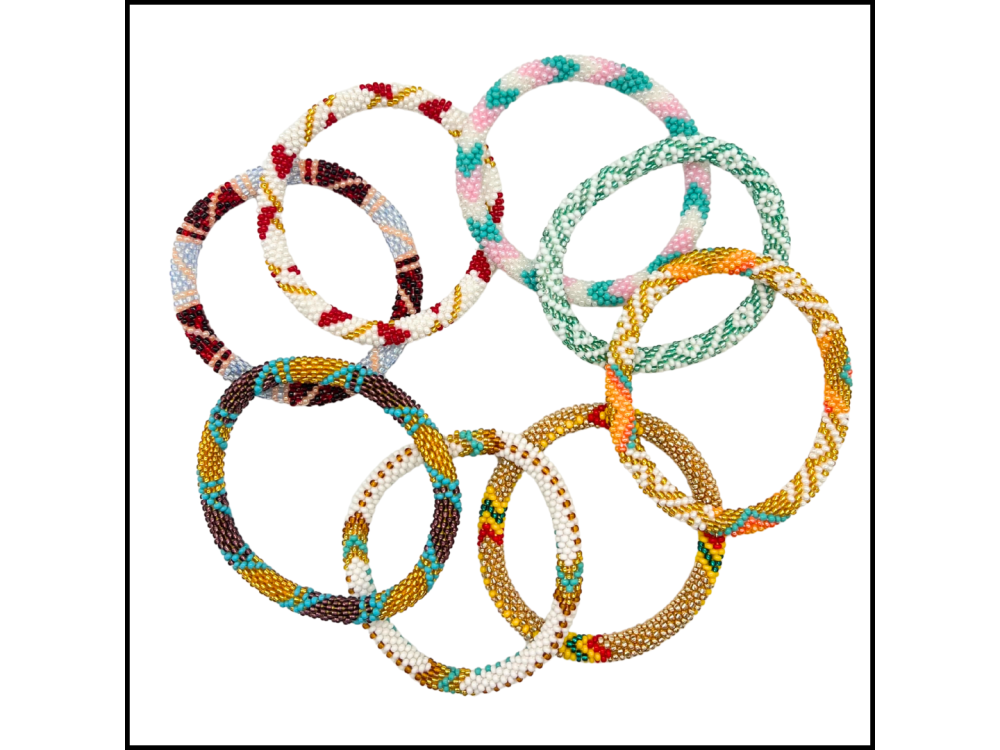 Each bracelet is handmade in Nepal by artisan women. Over two hours of meticulous crocheting goes into making a single seed bead bracelet. Bracelets are made using a durable cotton thread and Czech glass beads.